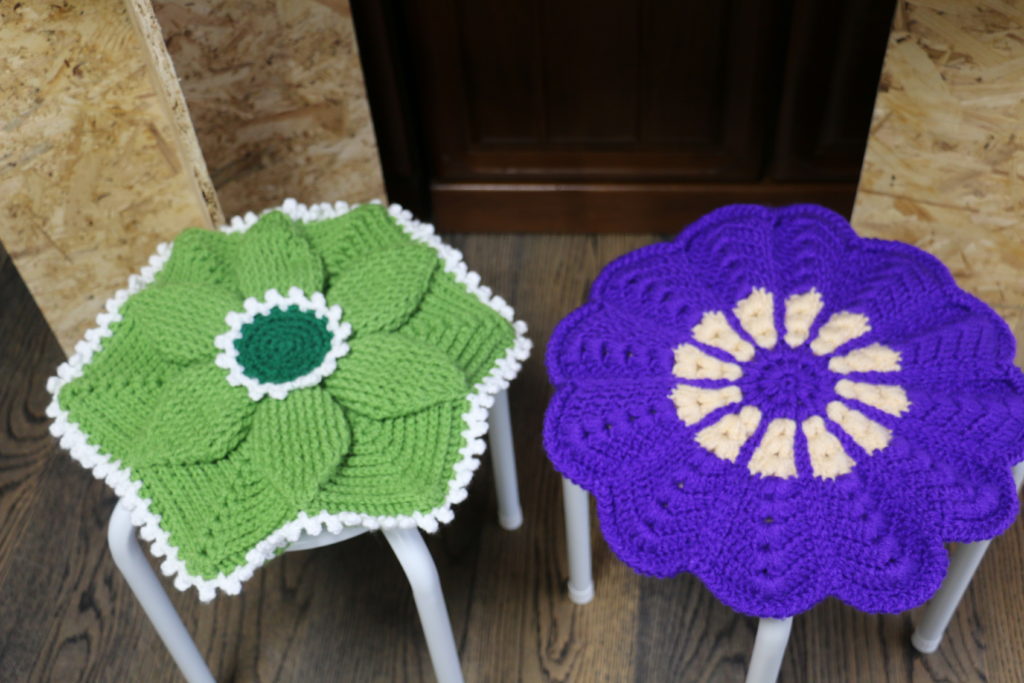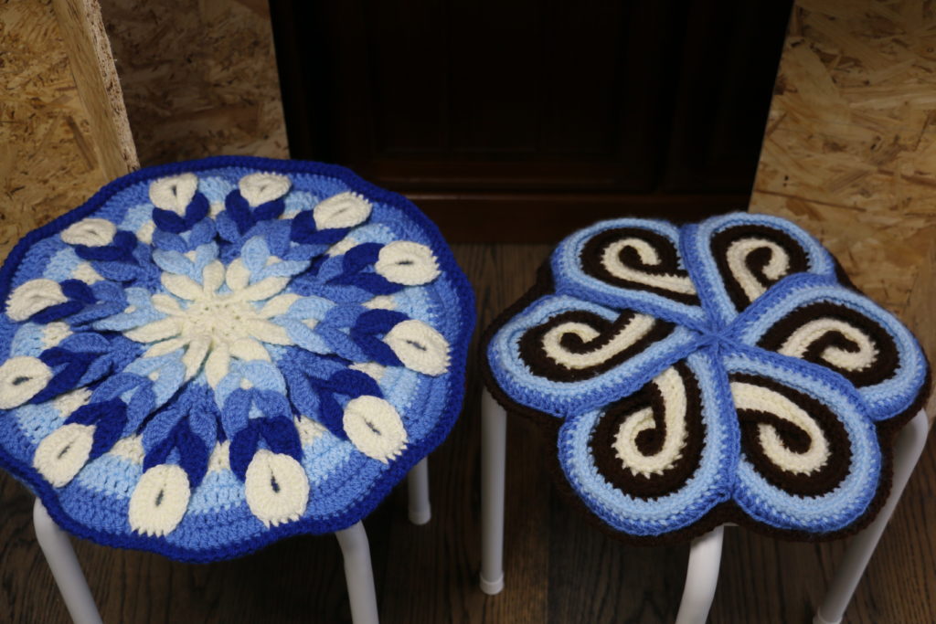 五箇食農工房「ことら」内に、手編みの座布団がずら~り並んでいます。見応えがあります。寒~い季節にぴったりです。 食卓の椅子に、愛車の運転席・助手席にペアでお使いになれます。 手に取って暖かい愛を感じてください。